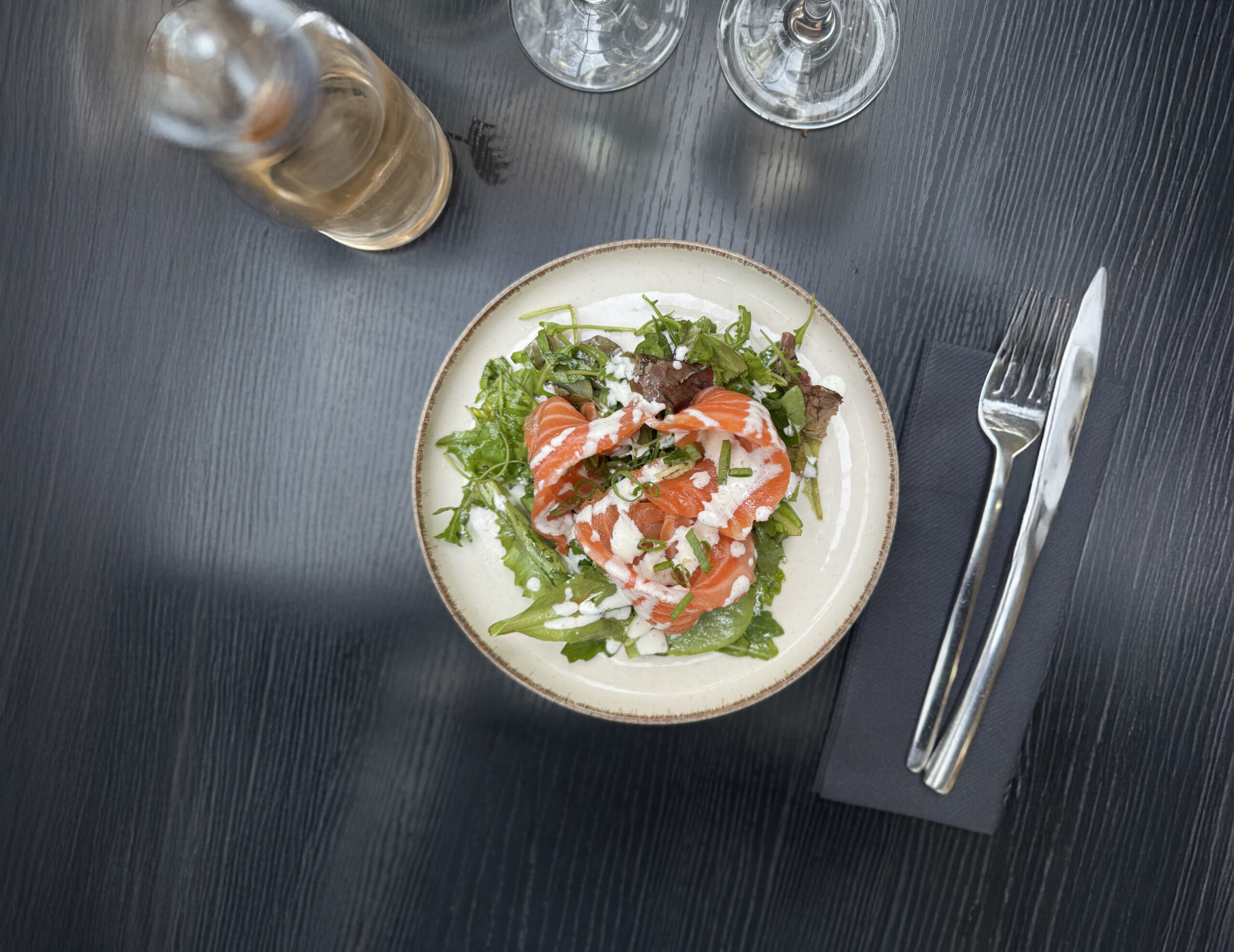 Saumon fumé, sucrine, roquettte,avocat, concombre, tomates cerises,oignons rouges